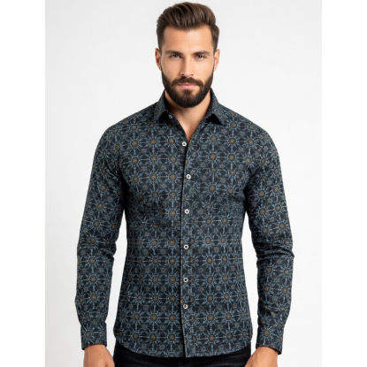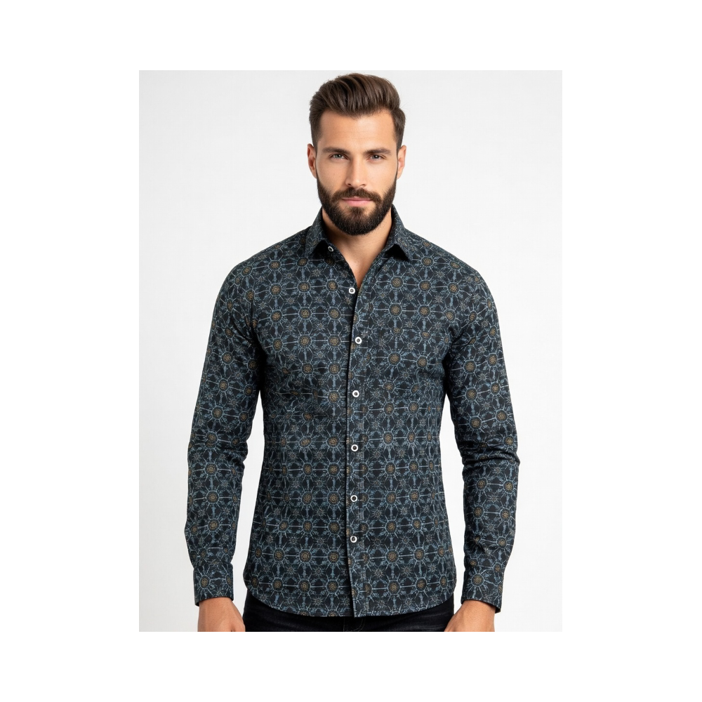 Camisa hombre manga larga SLIM con pinzas en la espalda,color negra con estampado de mandalas geométricas y estilo caleidoscópico,de algodón/elastán que le proporciona una suavidad,ajuste y comodidad.DISEÑADO Y FABRICADO EN ESPAÑA.