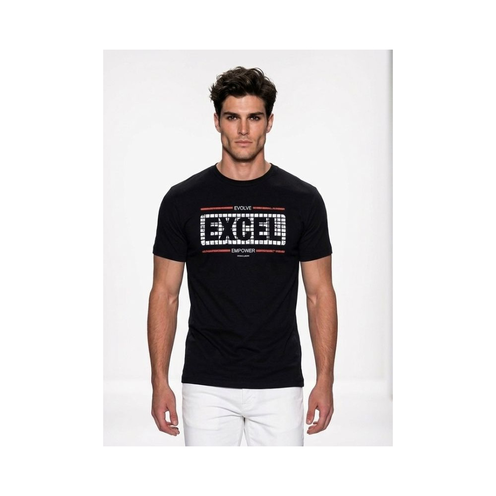 CAMISETA HOMBRE NEGRA CON ESTAMPACION BLANCA Y ROJA,MANGA CORTA,VISCOSA/ELASTÁN QUE LE APORTA UNA SUAVIDAD,AJUSTE Y COMODIDAD.PRODUCTO DE CALIDAD DISEÑADO Y FABRICADO EN ESPAÑA.