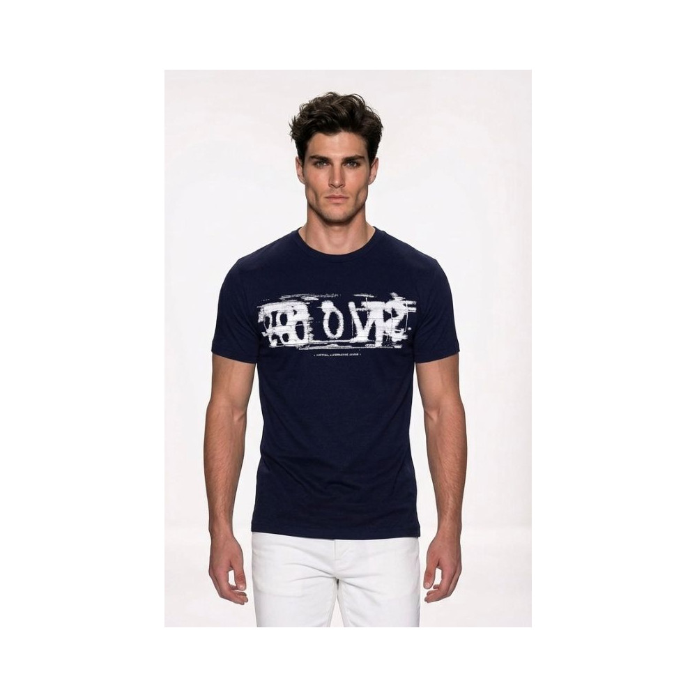 CAMISETA HOMBRE AZUL MARINO CON ESTAMPACIÓN EN BLANCO,MANGA CORTA,VISCOSA/ELASTÁN QUE LE APORTA UNA SUAVIDAD, AJUSTE Y COMODIDAD.PRODUCTO DE CALIDAD, DISEÑADO Y FABRICADO EN ESPAÑA.